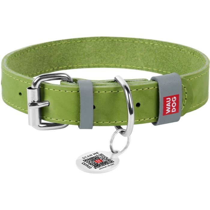 Матеріал - натуральна шкіра, Ширина - 25 мм, Довжина - 38-49 см, наявність «розумного» адресника з QR паспортом, для всіх порід собак, Колір - салатовий