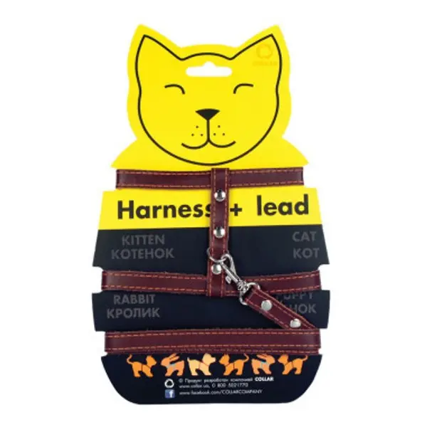 Шлейка "CoLLaR" котяча з повідцем шкіряна на планшеті (ширина 12мм, А:22-30см,В:30-40см, довжина 122см) коричневий (48230893