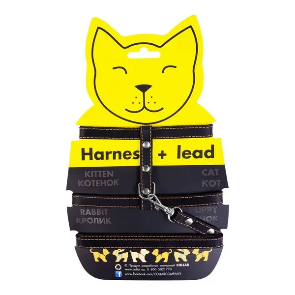 Шлейка "CoLLaR" котяча з повідцем шкіряна на планшеті (ширина 12мм, А:22-30см,В:30-40см, довжина 122см) чорний (482008249266