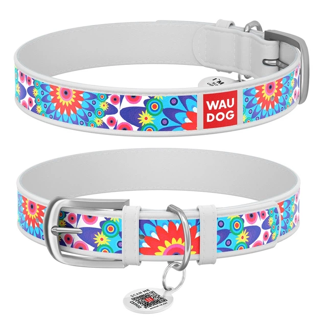 Нашийник для собак середніх порід шкіряний WAUDOG Design Квіти білий L, довжина 38–49 см, ширина 25 мм, з металевою пряжкою