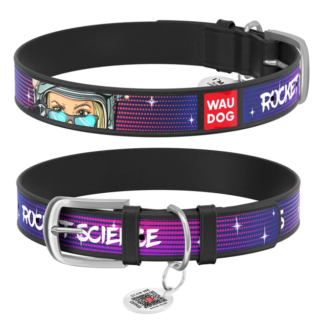 Нашийник для собак шкіряний WAUDOG Design з QR паспортом, малюнок "Космос. Ракетобудування", L, Ш 25 мм, Дов 37-48 см чорний