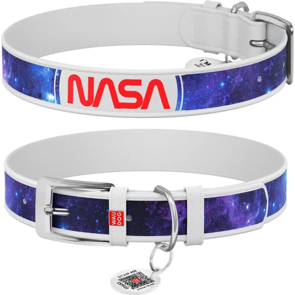 Нашийник для собак шкіряний WAUDOG Design з QR паспортом, малюнок "NASA21", L, Ш 25 мм, Д 38-49 см білий