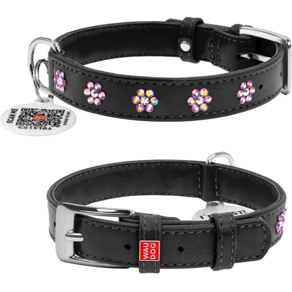 Нашийник для собак шкіряний WAUDOG Glamour з QR паспортом, з клейовими стразами "Квіти", Ш 20 мм, Дов 30-39 см