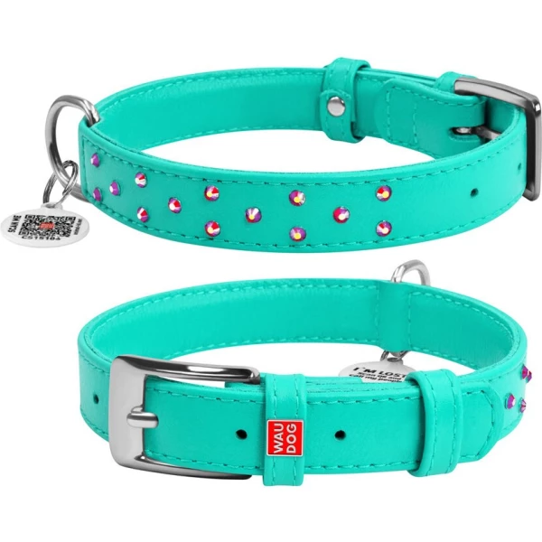 Нашийник для собак шкіряний WAUDOG Glamour з QR паспортом, з клейовими стразами, Ш 25 мм, Дов 38-49 см ментоловий