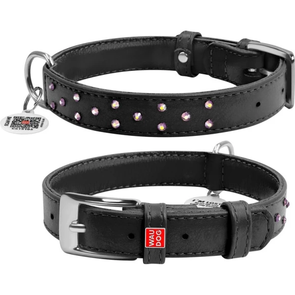 Нашийник для собак шкіряний WAUDOG Glamour з QR паспортом, з клейовими стразами, Ш 25 мм, Дов 38-49 см чорний