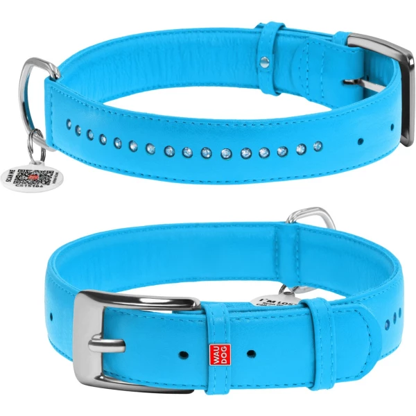 Нашийник для собак шкіряний WAUDOG Glamour з QR паспортом, подвійний зі стразами, L, Ш 25 мм, Дов 38-49 см блакитний