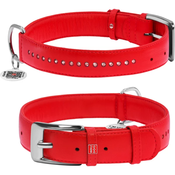 Нашийник для собак шкіряний WAUDOG Glamour з QR паспортом, подвійний зі стразами, L, Ш 25 мм, Дов 38-49 см червоний