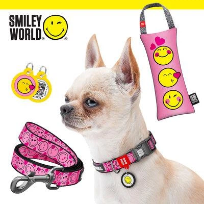 Набір для собак WAUDOG (нашийник + повідець + м’яка іграшка + QR-адресник), дизайн «Смайли на рожевому», розмір S, ширина ст