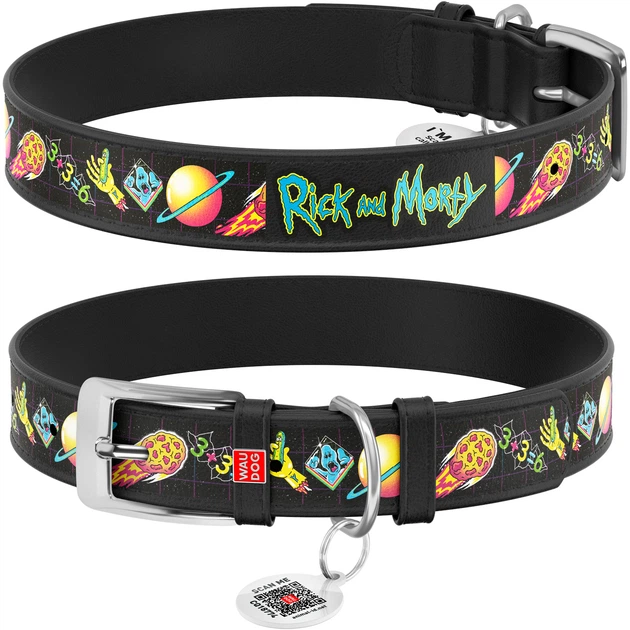 Нашийник для собак шкіряний WAUDOG Design з QR паспортом, малюнок "Рік та Морті 3" Чорний 46-59 см 35 мм (3606-0282-01)