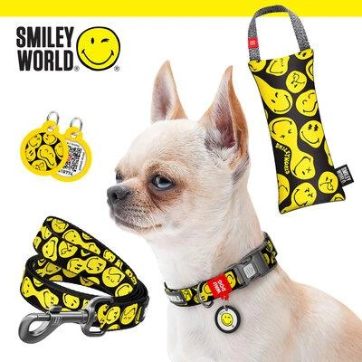 Набір для собак WAUDOG (нашийник + повідець + м’яка іграшка + QR-адресник), дизайн «Смайли на чорному», розмір M, ширина стр