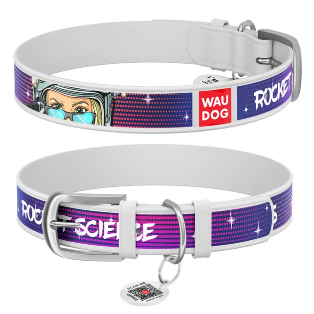 Нашийник для собак дуже великих порід шкіряний WAUDOG Design 3 з QR паспортом, малюнок «Космос. Ракетобудування», XL, білий,