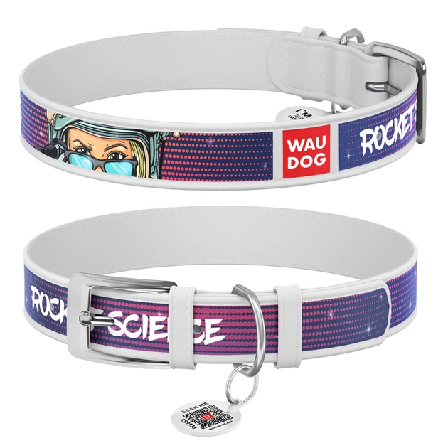 Нашийник для собак шкіряний WAUDOG Design з QR паспортом, Косм,ос. Ракетобудування, XL, Ш 35 мм, Д 46-60 см, білий