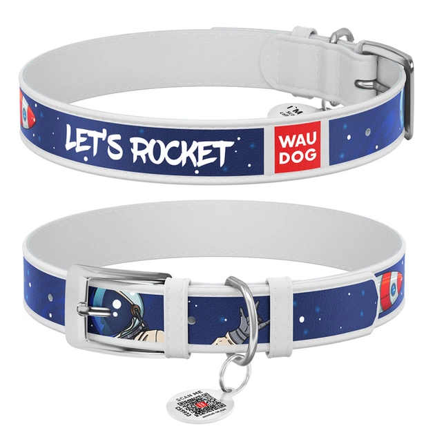 Нашийник для собак шкіряний WAUDOG Design з QR паспортом, Косм,ос. Ракета, XL, Ш 35 мм, Д 46-60 см, білий