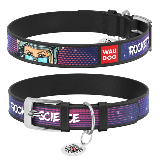 Нашийник для собак шкіряний WAUDOG Design з QR паспортом, Косм,ос. Ракетобудування, XL, Ш 35 мм, Д 46-60 см, чорний