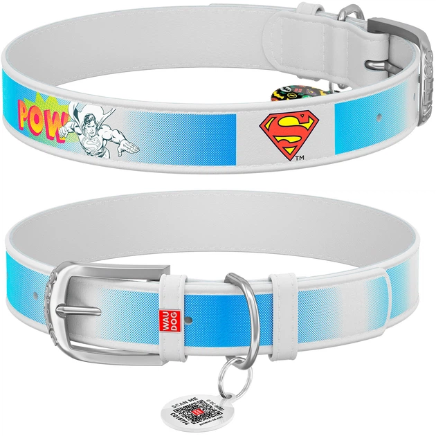 Шкіряний нашийник для собак WAUDOG Design з QR паспортом, малюнок "Супермен2", металева пряжка Білий 46-59 см 35 мм (0035-10