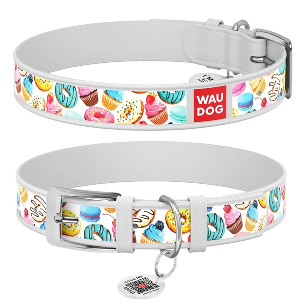 Нашийник для собак великих порід шкіряний WAUDOG Design Smart ID «Пончики», XL, білий, регульований 46–59 см, ширина 35 мм,