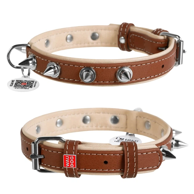 Амуніція Collar WAUDOG Soft Нашийник для собак шкіряний з QR паспортом, з шипами, коричневий M (z7193)