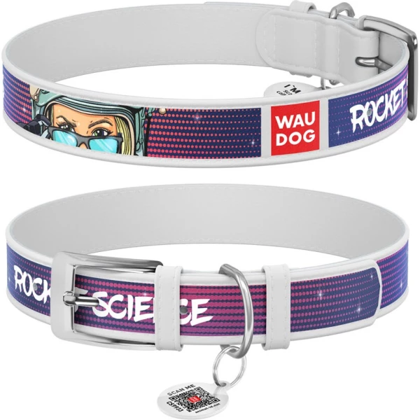Нашийник для собак шкіряний WAUDOG Design з QR паспортом, малюнок "Космос. Ракетобудування", XL, Ш 35 мм, Дов 44-58 см білий