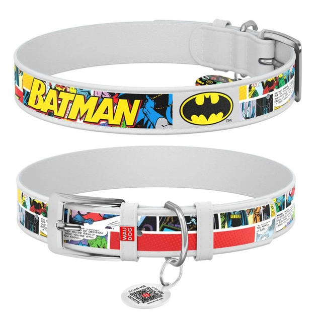 Нашийник для собак шкіряний WAUDOG Design з QR паспортом, малюнок "Бетмен1", Ш 35 мм, Дов 46-59 см, білий