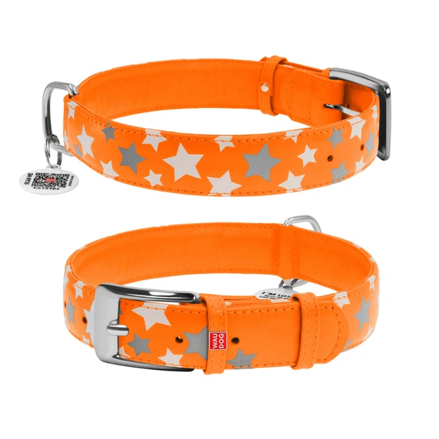 Нашийник для собак шкіряний WAUDOG Glamour візерунок Зірочка світиться/світловідбивний Ш 35 мм Дл 46-60 см Оранжевий