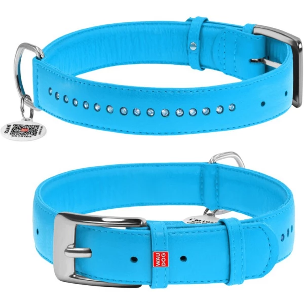 Нашийник для собак шкіряний WAUDOG Glamour з QR паспортом, подвійний зі стразами, M, Ш 20 мм, Дов 30-39 см блакитний Акція!
