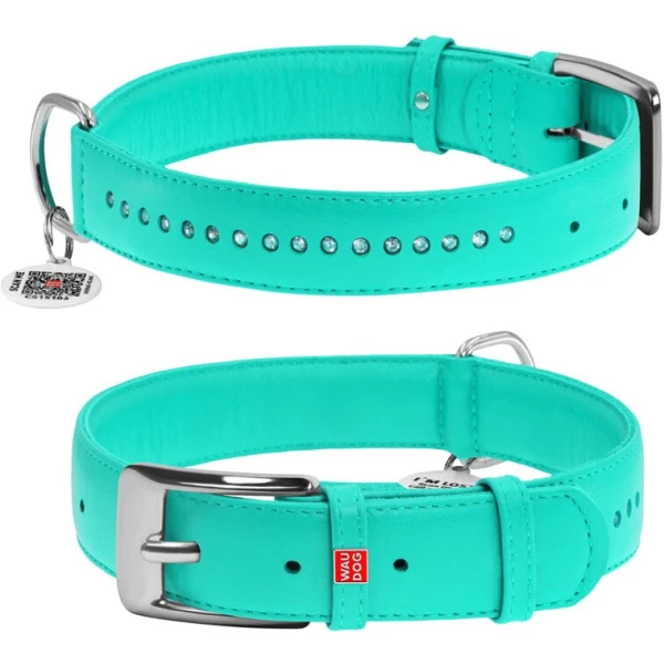 Нашийник для собак шкіряний WAUDOG Glamour з QR паспортом, подвійний зі стразами, M, Ш 20 мм, Дов 30-39 см ментоловий Акція!