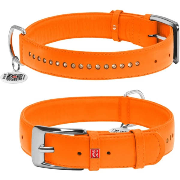 Нашийник для собак шкіряний WAUDOG Glamour з QR паспортом, подвійний зі стразами, M, Ш 20 мм, Дов 30-39 см помаранчевий Акці