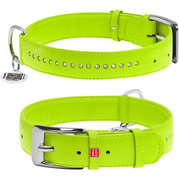 Нашийник для собак шкіряний WAUDOG Glamour з QR паспортом, подвійний зі стразами, M, Ш 20 мм, Дов 30-39 см салатовий Акція!