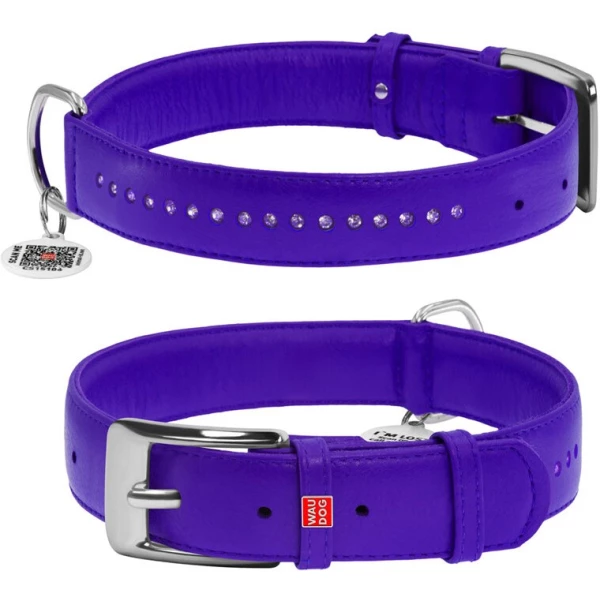 Нашийник для собак шкіряний WAUDOG Glamour з QR паспортом, подвійний зі стразами, M, Ш 20 мм, Дов 30-39 см фіолетовий Акція!