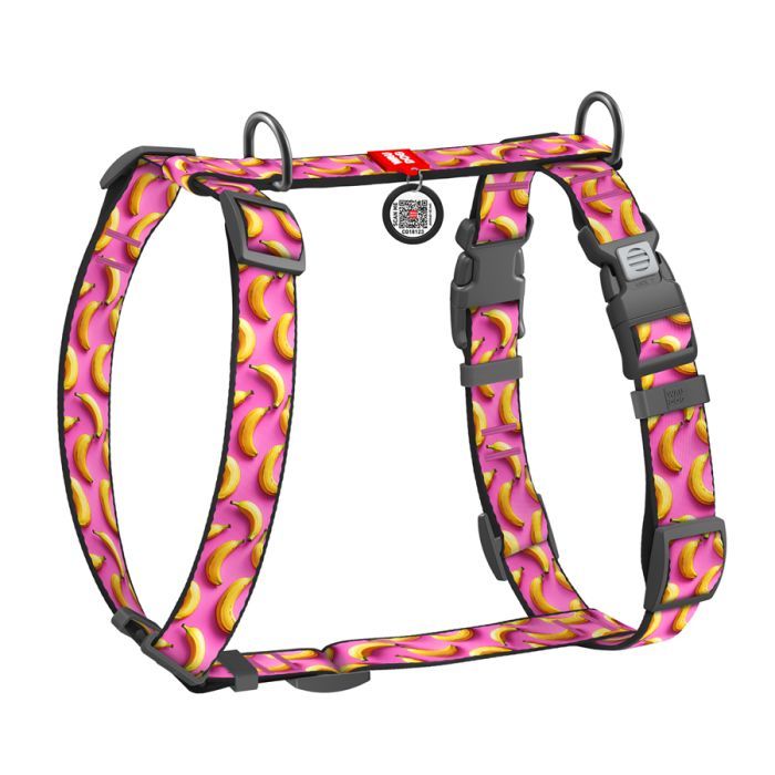 Шлея для собак WAUDOG Nylon анатомічна H-подібна з QR-паспортом "Банани на рожевому" пластиковий фастекс, L (345-4055) 345-4