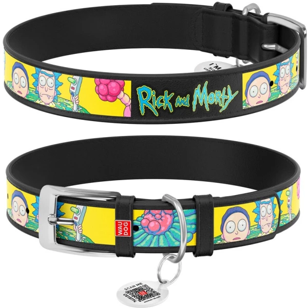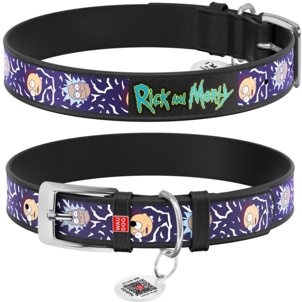 Нашийник для собак шкіряний WAUDOG Design з QR паспортом, малюнок "Рік та Морті 1", L, Ш 25 мм, Д 38-49 см чорний Акція!