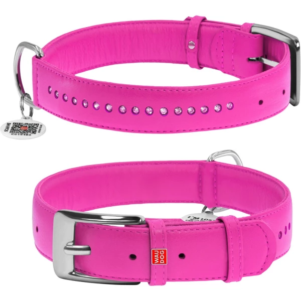 Нашийник для собак шкіряний WAUDOG Glamour з QR паспортом, подвійний зі стразами, L, Ш 25 мм, Дов 38-49 см рожевий Акція!