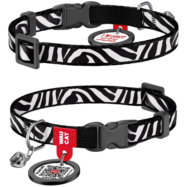 Нашийник для котів нейлоновий WAUCAT Nylon з QR паспортом, малюнок "Зебра", пластиковий фастекс, XS, 20-30 см, 10 мм (279-00