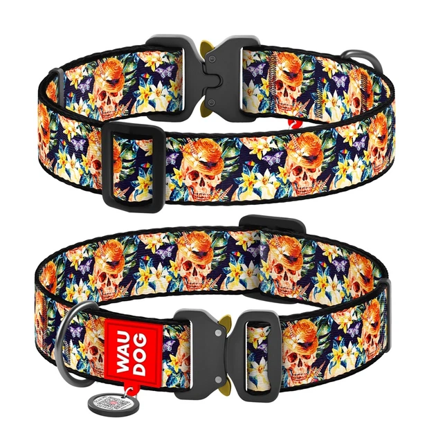 Нейлоновий нашийник для собак з QR паспортом, металева пряжка, малюнок Гламурні черепи, XXL, різнокольоровий