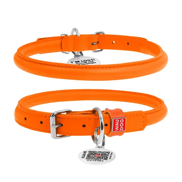 Нашийник для собак шкіряний WAUDOG Glamour з QR паспортом, круглий, Д 13 мм, Дов 53-63 см помаранчевий