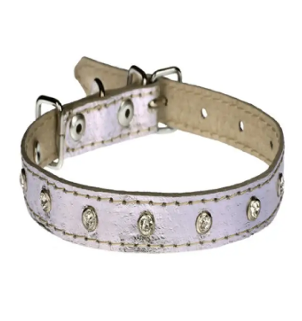 Нашийник Перламутр Вірний друг шкіряний подвійний прикрашений стразами срібний для вигулу собак 21-27 см (1944)