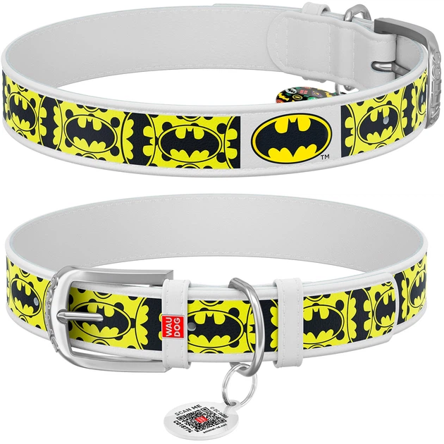 Шкіряний нашийник для собак WAUDOG Design з QR паспортом, малюнок "Бетмен4", металева пряжка Білий 38-49 см 25 мм (0025-1006