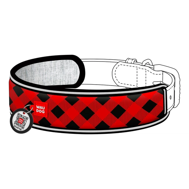 Ергономічна накладка на нашийник WAUDOG Nylon з QR-паспортом, малюнок "Шотландка червона" (розмір M- L , для ширини нашийник