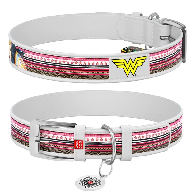 Нашийник для собак шкіряний WAUDOG Design 3 білий з QR паспортом, дизайн «Диво-жінка», розмір L, 25 мм, 38–49 см, арт. 0025-
