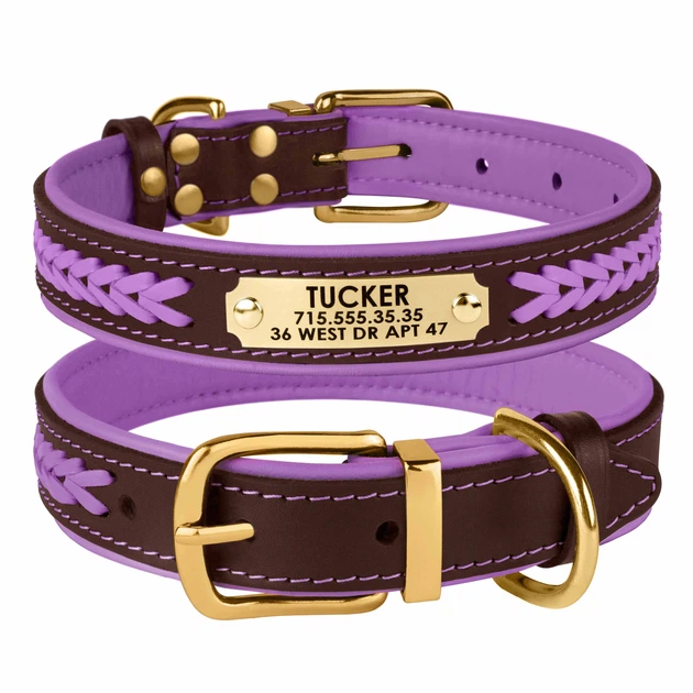 Нашийник для Собак Шкіряний BronzeDog з Плетенням Premium з Латунною Фурнітурою та Адресником Коричнево-Фіолетовий 17 мм 25-