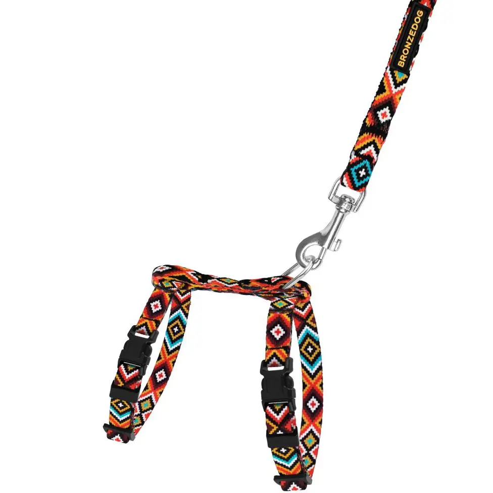 Шлея для котів та собак дрібних порід BronzeDog Urban Орнамент ацтеки з нашивкою та повідцем XS 18-27 см
