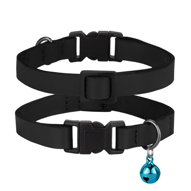 Нашийник для Котів Шкіряний Плоский BronzeDog Crazy з Синім Дзвіночком Чорний (46101)