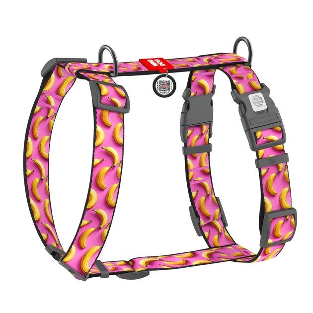 Шлей для собак анатомічний H-подібний WAUDOG Nylon з QR-паспортом, малюнок "Банані на розовому", пластиковий фастекс, XL, Ш