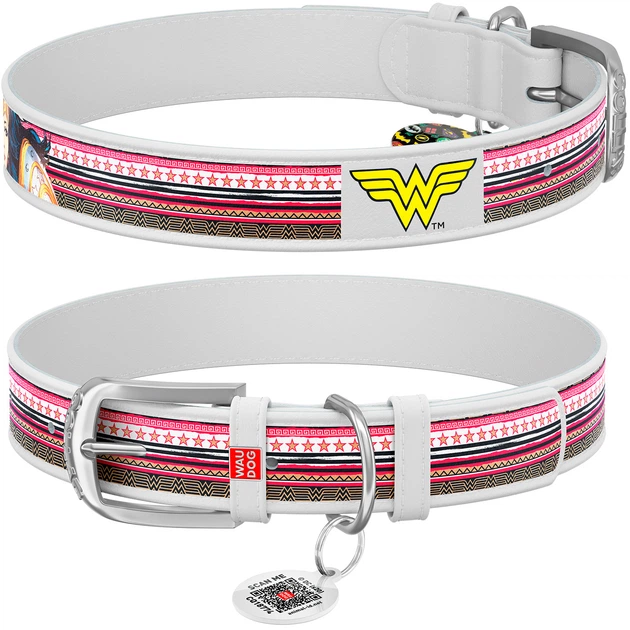 Шкіряний нашийник для собак WAUDOG Design з QR паспортом, малюнок "Чудо-жінка", металева пряжка Білий 18-24 см 12 мм (0012-1