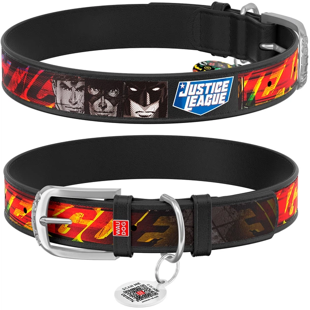Шкіряний нашийник для собак WAUDOG Design з QR паспортом, малюнок "Ліга Справедливості", металева пряжка Чорний 18-24 см 12