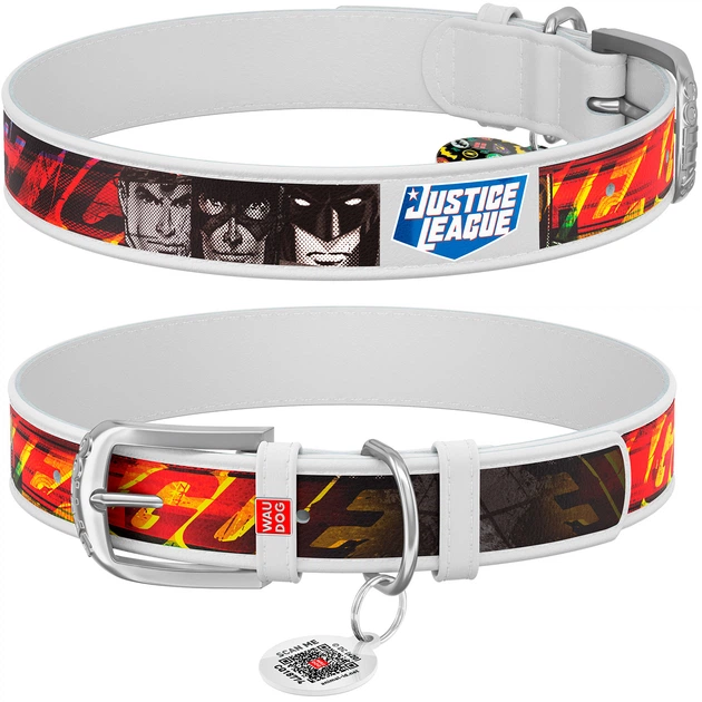 Шкіряний нашийник для собак WAUDOG Design з QR паспортом, малюнок "Ліга Справедливості", металева пряжка Білий 18-24 см 12 м