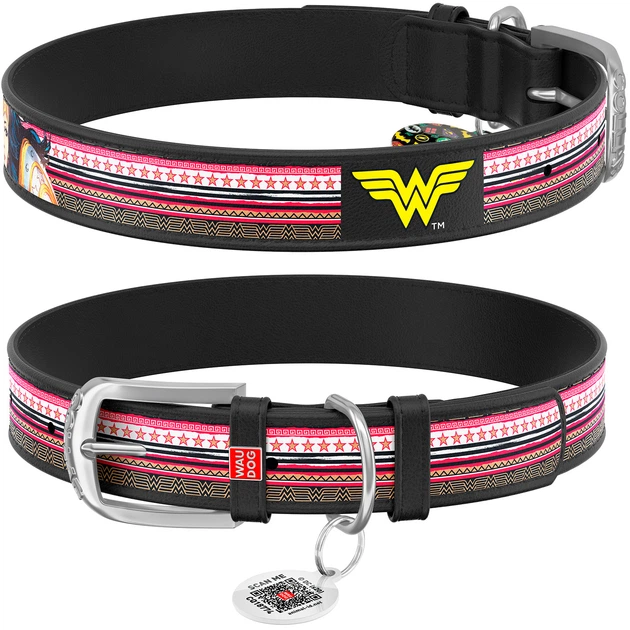 Шкіряний нашийник для собак WAUDOG Design з QR паспортом, малюнок "Чудо-жінка", металева пряжка Чорний 20-28 см 12 мм (0013-