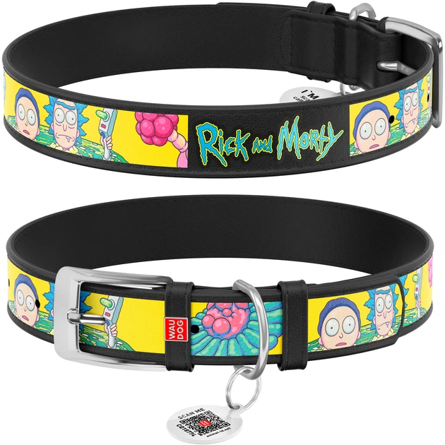 Нашийник для собак шкіряний WAUDOG Design з QR паспортом, малюнок "Рік та Морті 2" Чорний 18-24 см 12 мм (3601-0281-01)