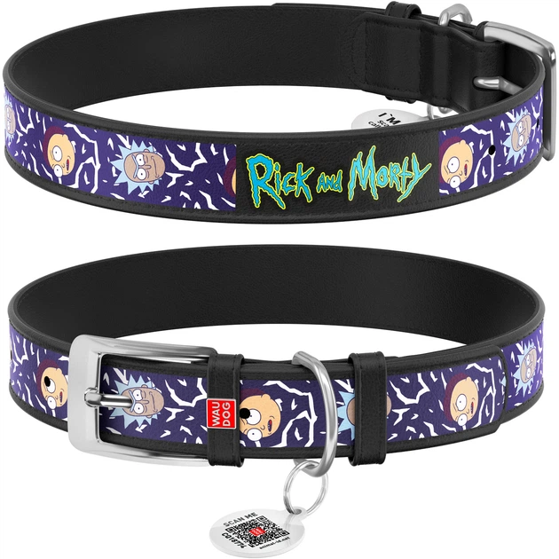 Нашийник для собак шкіряний WAUDOG Design з QR паспортом, малюнок "Рік та Морті 2" Чорний 20-28 см 12 мм (3602-0281-01)