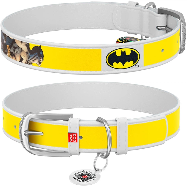 Шкіряний нашийник для собак WAUDOG Design з QR паспортом, малюнок "Бетмен2", металева пряжка Білий 20-28 см 12 мм (0013-1004